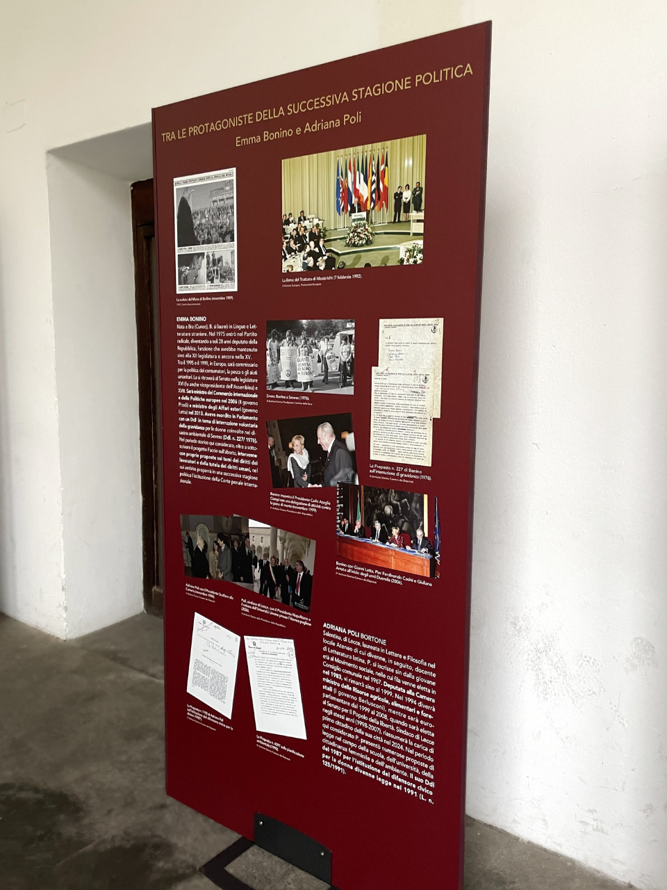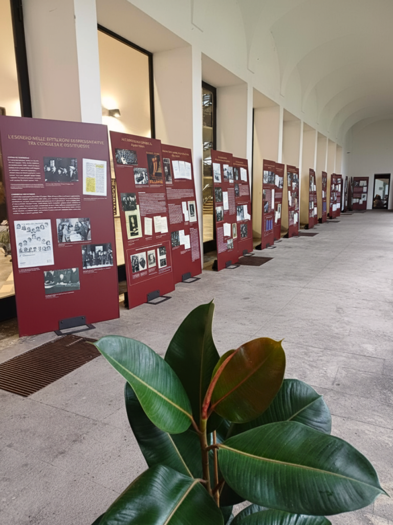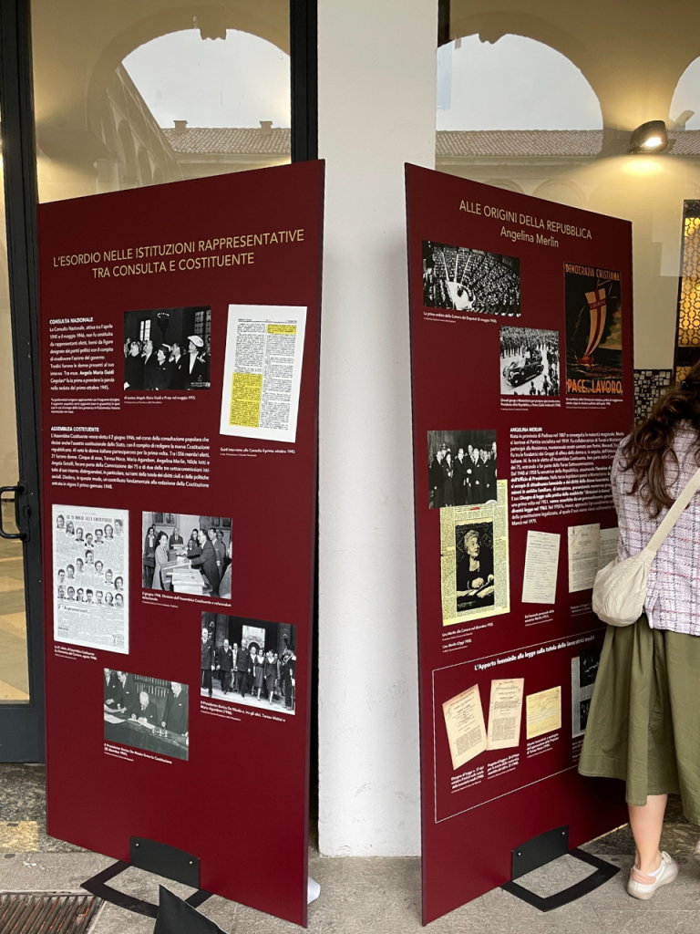 I pannelli sono stati progettati tenendo conto della disposizione degli spazi, così da garantire un percorso chiaro e facilmente fruibile. Progettata e allestita seguendo la cronologia della storia, la mostra è stata pensata per accompagnare il pubblico lungo le tappe delle conquiste femminili nelle istituzioni italiane. Abbiamo lavorato anche sulla resistenza dei materiali alle condizioni atmosferiche, visto l’allestimento all’aperto, e considerato il costante via vai di studenti e visitatori, scegliendo soluzioni strutturali che rendessero la mostra accessibile, leggibile e duratura.